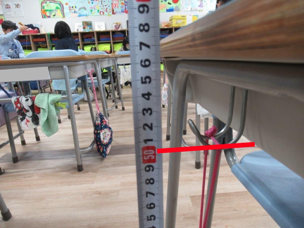 給食セットが入った巾着袋をかける机の横のフックは、床から約50cmの高さにあります。ですから、ひもの長さも含めて40cmくらいにおさまるくらいが目安です。長いと床に引きずったり、掃除のときに掃いたほこりがくっついたりしてしまいます。
