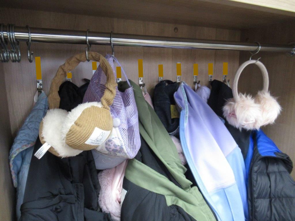 隣との間隔があまりないので、紐などでしっかりかけることができないと、隣の子がコートをとったときに落ちてしまうかもしれません。