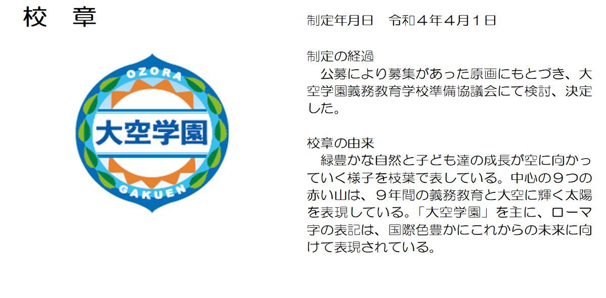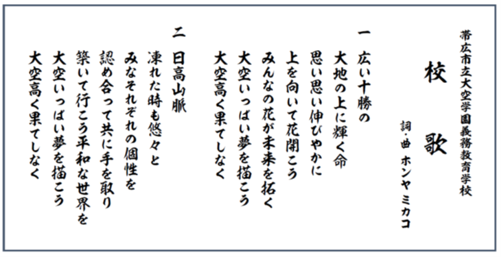 大空小学校、大空中学校出身のオカリナ奏者ホンヤミカコ氏に作詞・作曲を依頼、歌詞については、大空小中の児童・生徒、保護者から募集した言葉をもとに作成、大空学園義務教育学校準備協議会にて検討、決定した。